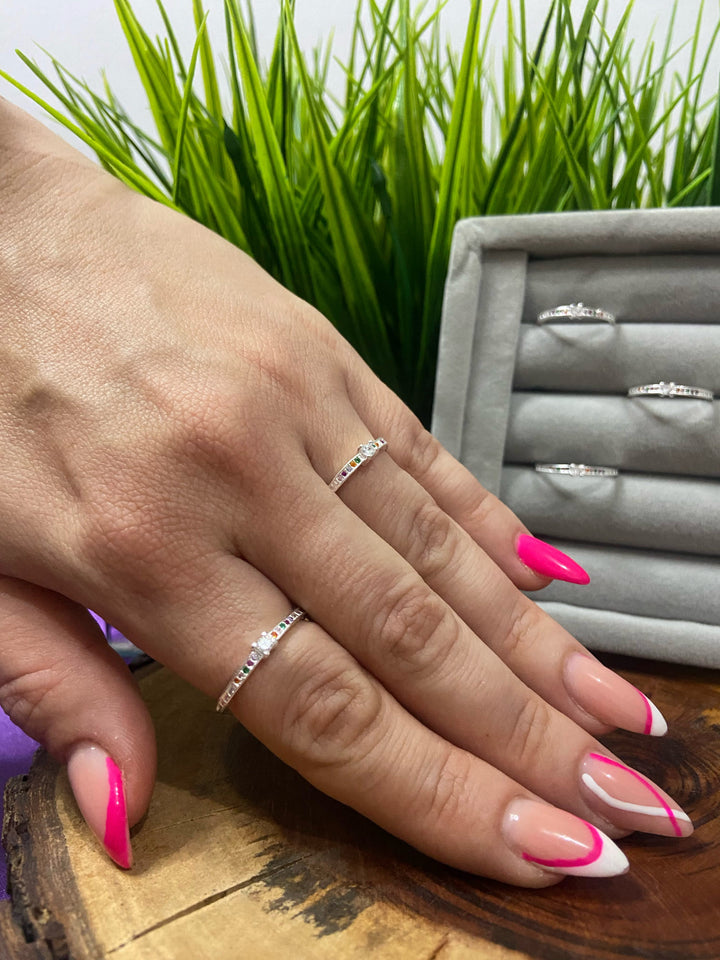 Um anel delicado e moderno feito em Prata 925, com detalhes únicos que encantam. Sua haste fina é adornada com zircônias coloridas e uma zircônia branca central, criando um contraste vibrante e sofisticado. Perfeito para quem busca um acessório leve, divertido e elegante para o dia a dia ou composições mais ousadas.