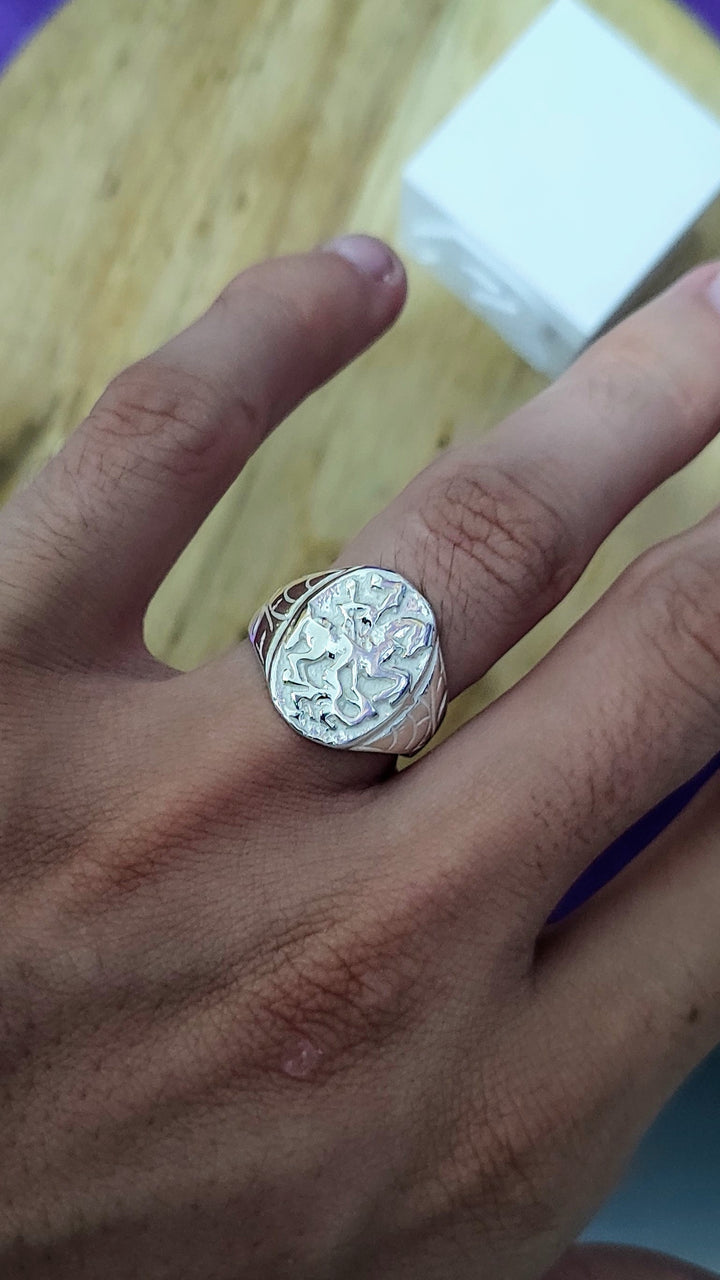Carregado de força e proteção, este anel traz a poderosa imagem de São Jorge em alto relevo sobre uma base redonda. Feito inteiramente em prata 925, combina elegância e significado espiritual, sendo ideal para quem busca estilo com propósito. Os detalhes laterais esculpidos realçam a p